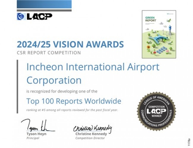 인천국제공항공사(사장 이학재)는 공사의 저탄소·친환경 경영성과를 담은 친환경 보고서(2025 그린 리포트)가 미국 커뮤니케이션 연맹이 주관하는 `2024-25 비전 어워즈(Vision Awards)`에서 2년 연속 사회책임보고서 부문 대상을 수상했다고 24일 밝혔다.