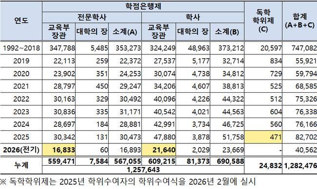 두 제도가 시작된 이후 2026년 2월 기준 누적 학위 취득자는 128만여 명에 달한다. 학점은행제 125만7,643명, 독학학위제 2만4,832명으로, 우리 사회 전반에 평생학습 기반이 꾸준히 확대돼 왔음을 보여준다.