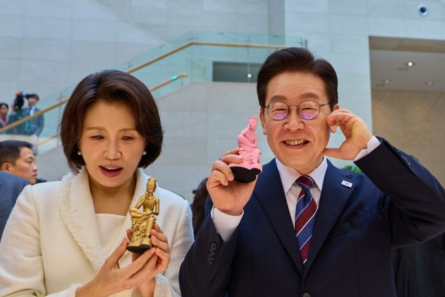 이재명 대통령과 김혜경 여사가 26일 서울 용산구 국립중앙박물관에서 열린 특별전 `우리들의 이순신`을 관람한 뒤 상품관에서 기념품과 함께 기념촬영을 하고 있다. (사진=청와대)