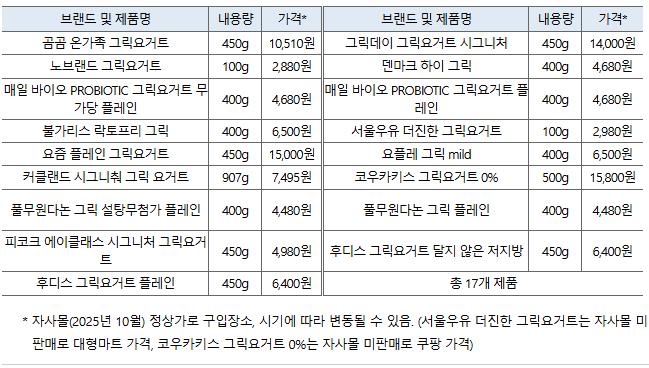 100g당 가격은 826원(커클랜드 시그니춰 그릭 요거트)에서 3,333원(요즘 플레인 그릭요거트)까지로 최대 4배 차이가 났다. 고형분(수분 제외 성분) 함량이 높은 제품일수록 질감이 단단하고 가격도 높은 경향을 보였다.