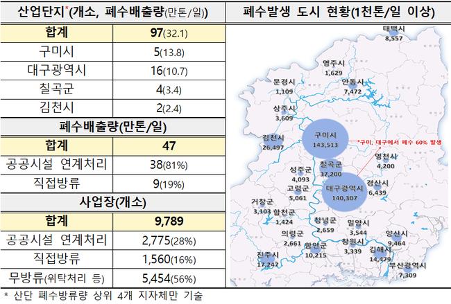 수질오염사고 대응도 강화한다. 현재 낙동강 수계 폐수의 96%는 수질원격자동측정체계(TMS)로 감시 중이며, 산업단지 하류 수질자동측정망을 51곳에서 61곳으로 늘린다. 산업단지 완충저류시설 32곳 설치를 완료하고, 2028년까지 대구에 ‘수질오염사고 통합방제센터’를 구축할 계획이다.