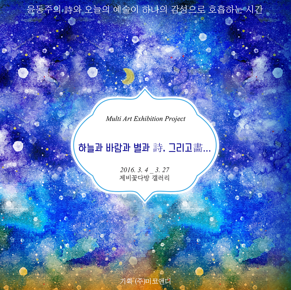 아트워크 큐레이션 전문기업 미코앤디는 3월 4일부터 27일까지 부암동 제비꽃다방 갤러리에서 시인 윤동주의 시와 그림, 낭송과 음악이 어우러진 멀티 아트 전시프로젝트 ‘하늘과 바람과 별과 詩, 그리고(畵) 展’을 펼친다.