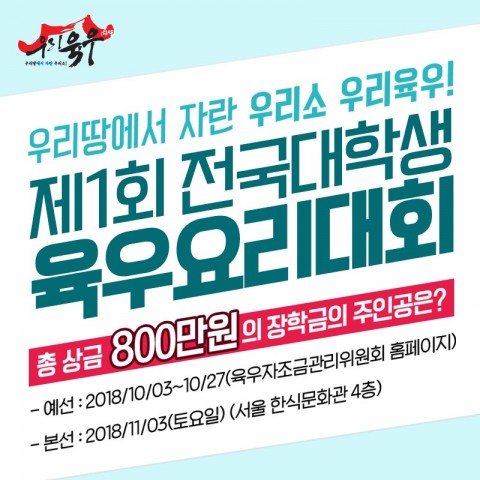본선 요리대회는 11월 3일 오전 11시 서울 중구 청계천로 40 CKL 기업지원센터 4층 한식문화관에서 진행되며, 대상 1팀(상금200만원), 우수상 2팀(상금 100만원), 육우자조금인증점상 1팀(육우명품셋트) 등을 선정해 시상한다.