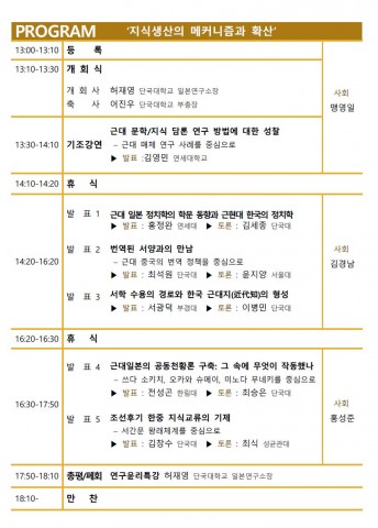 이번 학술대회에서는 김영민 연세대 교수가 ‘근대 문학/지식 담론 연구 방법에 대한 성찰- 근대 매체 연구 사례를 중심으로’라는 제목으로 기조 강연을 하고, 연세대 홍정완 교수의 ‘근대 일본 정치학의 학문 동향과 근현대 한국의 정치학’, 최석원 단국대 교수의 ‘번역된 서양과의 만남-근대 중국의 번역 정책을 중심으로’, 서광덕 부경대 교수의 ‘서학 수용의 경로와 한국 近代知의 형성’, 전성곤 한림대 교수의 ‘근대 일본의 공동천황론 구축: 그 속에 무엇이 작동했나-쓰다 소키치, 오카와 슈메이, 미노다 무네키를 중심으로’, 김창수 단국대 교수의 ‘조선후기 한중 지식교류의 기제-서간문 왕래체계를 중심으로’ 등 5편의 논문이 발표된다.