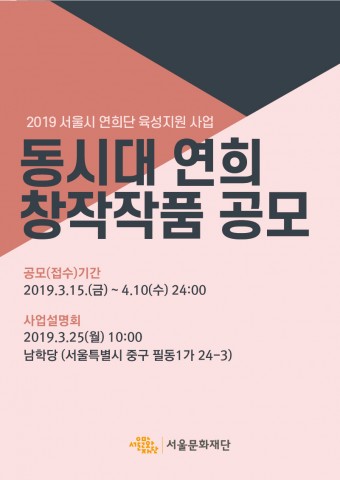 ▲ 동시대 연희 창작작품 공모 웹 포스터서울문화재단(대표이사 김종휘)이 전통과 현대를 아우르는 서울의 대표 연희 콘텐츠 발굴을 위한 <2019 서울시 연희단 육성지원 사업-동시대 연희 창작작품 지원사업 공모>를 15일(금)부터 4월 10일(수) 24시까지 온라인으로 접수 받는다.