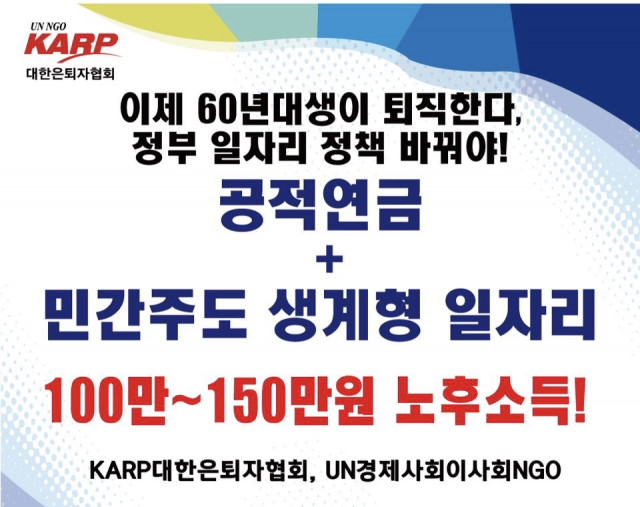 KARP대한은퇴자협회는 16일(화) 오전 10시 청와대 앞에서 노년 일자리 정책의 양과 질에서 세대의 변화에 따른 변화를 촉구하는 ‘60년대생이 퇴직한다, 공적연금 + 민간주도형 일자리로 100만~150만원 생계형 일자리 정책제안 회견’을 갖는다.