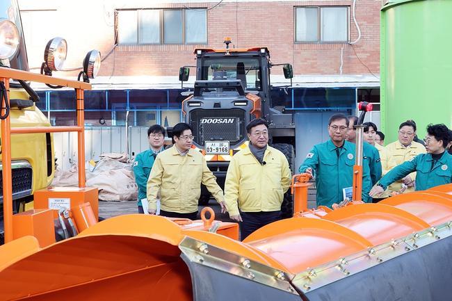 윤호중 행정안전부 장관이 18일 오전 서울시 제설발진기지인 남부도로사업소를 방문하여 제설 대응 체계 및 제설자원 관리실태 등을 점검 하고 있다.