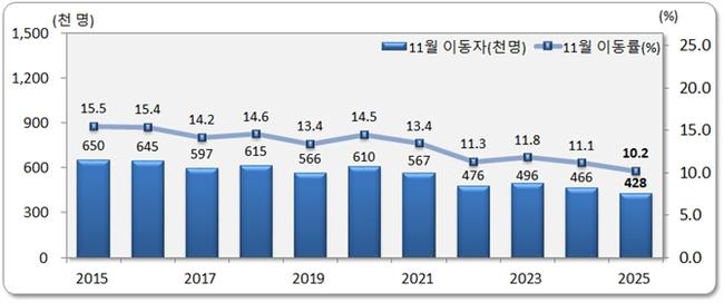 통계청 ‘2025년 11월 국내인구이동통계’에 따르면 11월 국내 이동자 수는 42만8000명으로 1년 전보다 8.2% 감소했고, 인구이동률은 10.2%로 전년 동월 대비 0.9%포인트 낮아졌다.