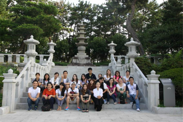 서울유스호스텔에서 주관하는 호스텔링 코리아 참가 대학생들이 문화교류활동의 일환으로 전북 익산의 소태산 대종사 성적지를 참배하고 있다.